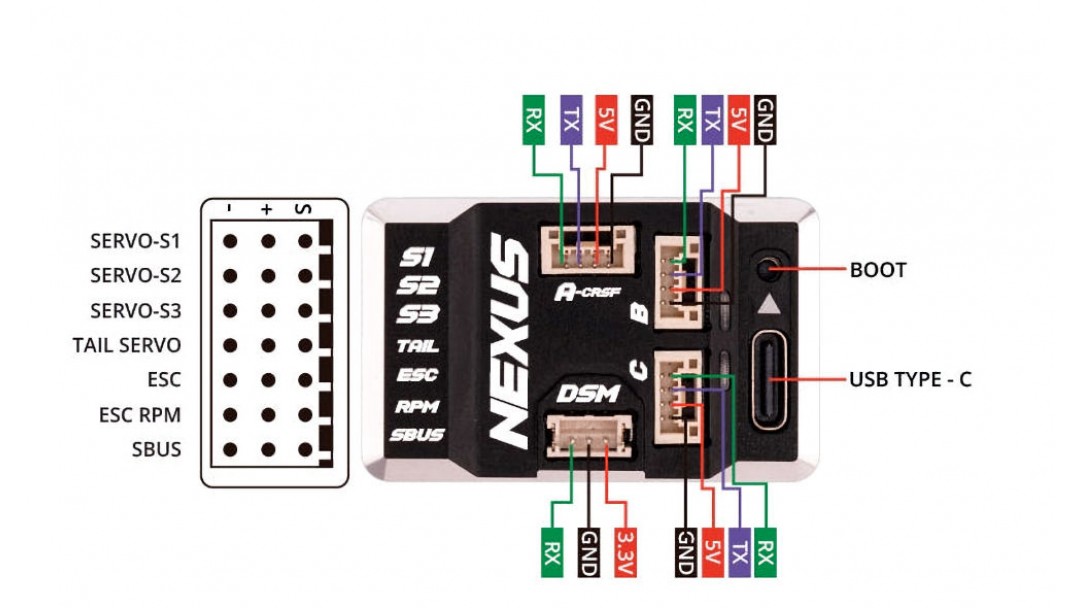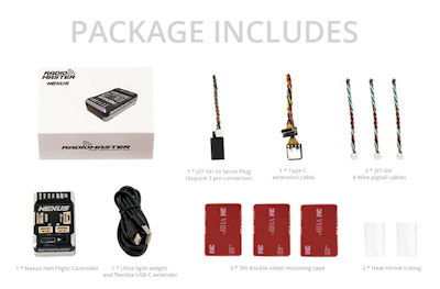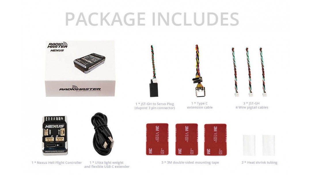 Package Includes* NEXUS Helicopter Flight Controller x 1 JST-GH 4 Wire Pigtail Cables x 3 JST-GH to Servo Plug (Dupont 3 Pin Connector) x 1 Ultra Light-Weight Flexible USB-C Extender x 1 Type C Extension Cable x 1 3M Double-Sided Mounting Tape x 3 Heat Shrink Tubing x 2 *Contents Subject to Change by Manufacture |