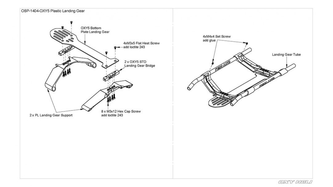 Package Includes OXY5 Plastic Lander Gear Set x 1 Landing Gear Support x 4 Landing Gear Tube x 2 Landing Gear Bridge x 2 Socket Screw (M3x12mm) x 8 Flat Head Screw (M3x5mm) x 4 Set Screw (M4x4mm) x 4 |