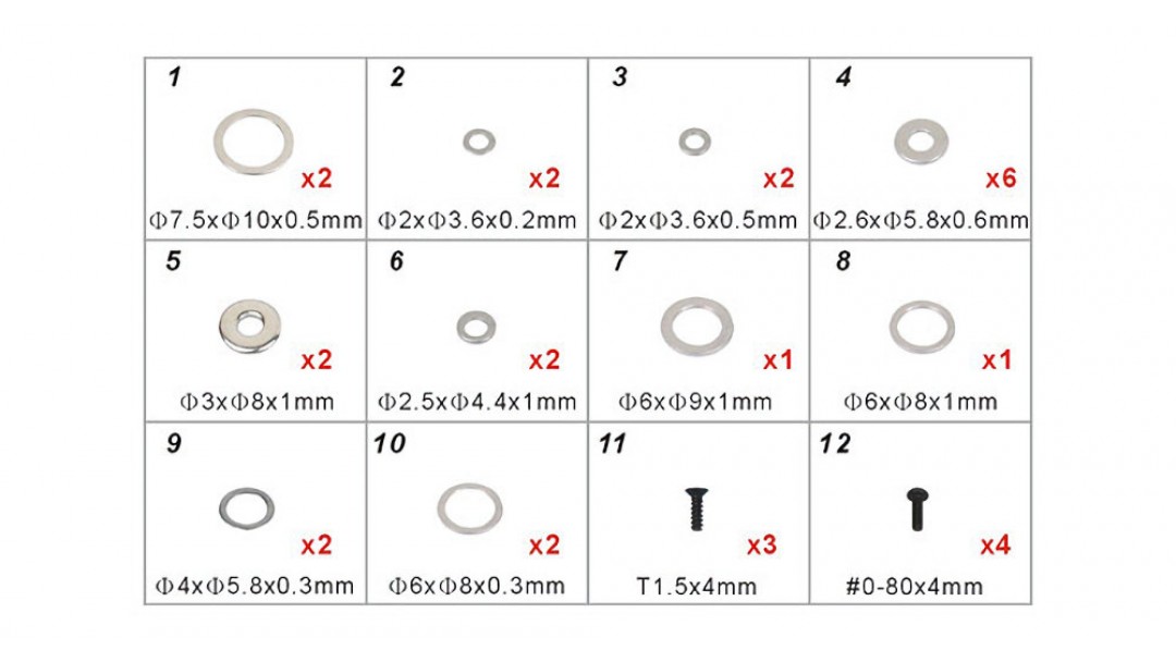 Spindle Bearing Spacer (7.5x10x0.5mm) x 2 Contol Arm Washer (2x3.6x0.2mm) x 2 Belt Pully Washer (2x3.6x0.5mm) x 2 Tail Rotor Spindle Washer (2.6x5.8x0.6mm) x 6 Spindle Spacer (3x8x1mm) x 2 Motor Belt Pully Washer (2.5x4.4x1mm) x 2 Main Belt Pulley Washer (6x9x1mm) x 1 Tail Bearing Holder Washer (6x8x1mm) x 1 Tail Rotor Holder Washer (4x5.8x0.3mm) x 2 Tail Rotor Holder Washer (6x8x0.3mm) x 2 Phillips Flat Head Self Tapping Screw (T1.5x4mm) x 3 Socket Button Head Self Tapping Screw (#0-80x4mm) x 4 Socket Button Head Screw (M2x5mm) x 2 Socket Button Head Screw (M2x8mm) x 2 Socket Button Head Screw (M3x6mm) x 4 Socket Button Head Self Tapping Screw (T2.6x6mm) x 2 |
