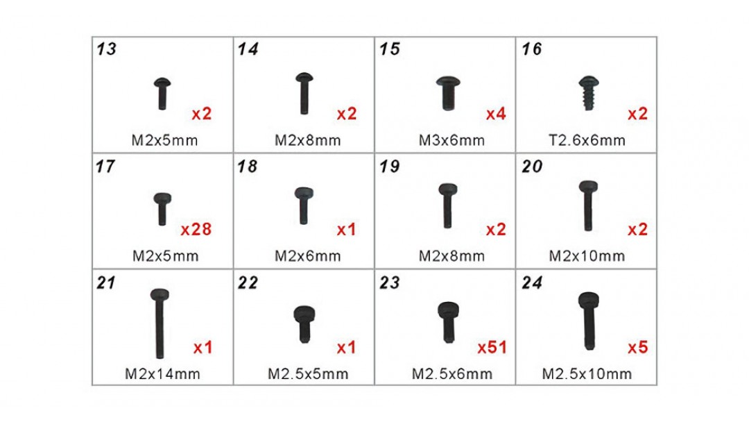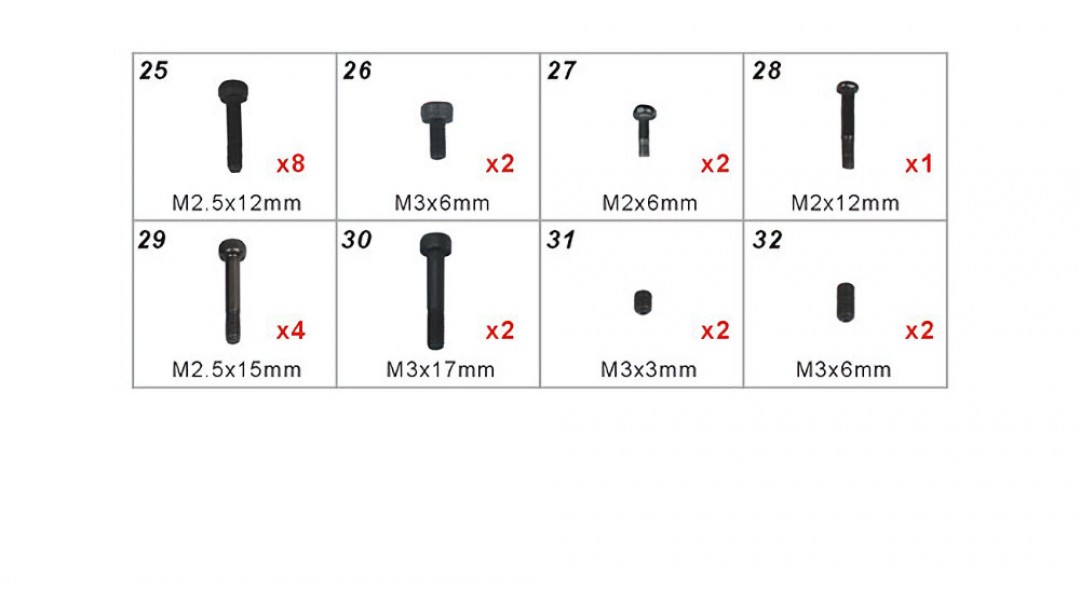 Socket Screw (M2x5mm) x 28 Socket Screw (M2x6mm) x 1 Socket Screw (M2x8mm) x 2 Socket Screw (M2x10mm) x 2 Socket Screw (M2x14mm) x 1 Socket Screw (M2.5x5mm) x 1 Socket Screw (M2.5x6mm) x 51 Socket Screw (M2.5x10mm) x 5 Socket Screw (M2.5x12mm) x 8 Socket Screw (M3x6mm) x 2 Collar Screw (M2x6mm) x 2 Socket Collar Screw (M2x12mm) x 1 Socket Collar Screw (M2.5x15mm) x 4 Socket Collar Screw (M3x17mm) x 2 M3 Set Screw (M3x3mm) x 2 M3 Set Screw (M3x6mm) x 2 |