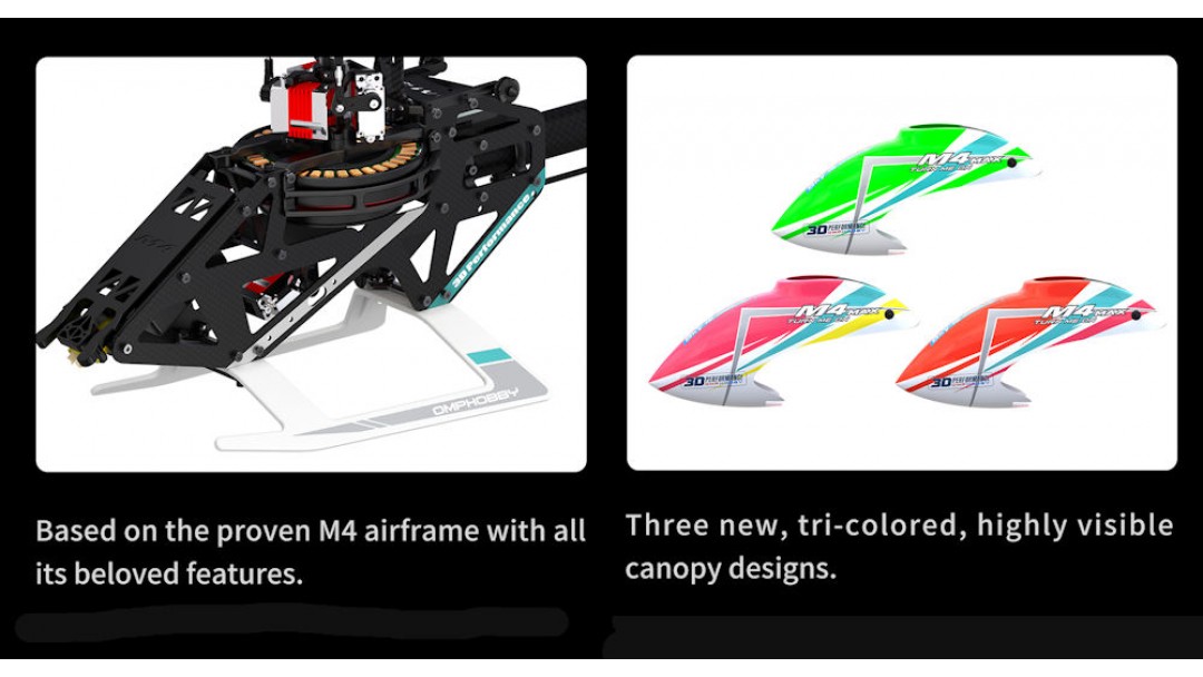 Product Information OMP Hobby M4 Max Combo (Includes Motor, ESC, and Servos) Optional Colors: Green, Pink Equipment Required for Assembly Transmitter (6-channel or more, helicopter system) Flybarless Gryo (Recommend Beastx) Receiver S.bus, DMSX/DMS2, 6-Channel Receiver 6S1P 22.2V 70C 2000mAh OMP Battery - OSHM4049 6S1p 22.2V 45C 2600mAh Gen ace Battery - GEA26006S45X6 ALIGN AP800 Digital Pitch Gauge - HET80001 LiPo Battery Charger Misc. RC Helicopter Building Equipment and Supplies Soldering Tool / Supplies Threadlocker Blue and Red (Recommend Loctite Brand) Silicone Grease