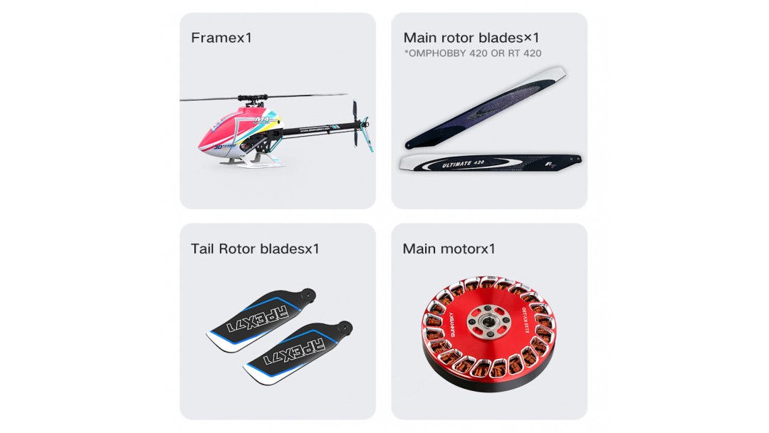 Specifications Assembly Required: Yes Color: Begonia Pink ESC Connector: XT60 Connector Installed *Package Includes OMP Hobby M4 Max Kit - Pink 1 420 Main Blade Set x 1 71mm Tail Blade Set x 1 |