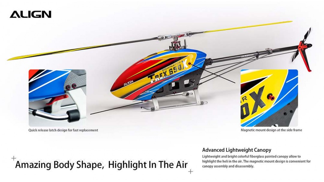 “T-REX 650X Dominator Super Combo” is special design both for hobby use and 3D competition. T-REX 650X body size is between T-REX 600 and T-REX 700 grade helicopter. It adopts integrated composite material and technology that efficiently enhance structure intensity and make repair convenience. The upper narrow main frame allow to strengthen the structure but also prevent body from deformation, vibration and gear abrasion in extreme flights. The lower wider main frame is designed with quick release latch for battery that makes battery assembly and disassembly more convenient and safe. The flybarless rotor head is low CG design better for 3D flight allow to reduce wind-resistance also improve superior flying feel and stability. So ALIGN T-REX 650X shows excellent flight performance in both 3D aggressive flight, slow 3D and F3C flight!